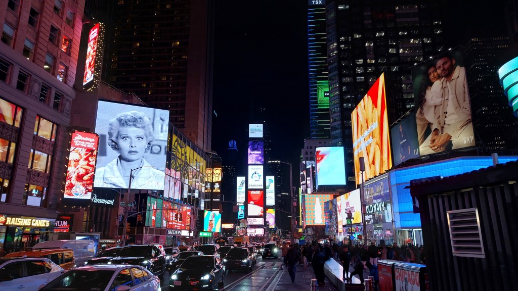Kurz noch den Blick nach oben gerichtet. Dort sieht man an allen Fassaden ständig wechselnde, übergroße LED-Werbetafeln, die zur sinnlichen Überforderung beitragen. Lärm, Rempeleien, fotografierende Touristen, als Filmfiguren verkleidete Kleinkünstler, stinkende Fressbuden, Demonstrationen, sich drehende Selfie-Spots, ein Recruiting Center der US Streitkräfte tun ihr Übriges. Trotzdem (oder deswegen?) – der Times Square und die ganze Gegend bleiben ein Anziehungspunkt für Touristen, Besucher der Broadway Shows und Geschäfte aller Art.