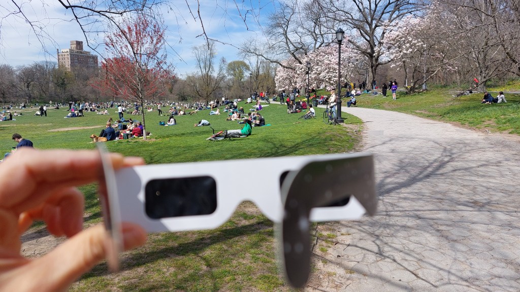 Das reicht aber, um ganz New York in Wallung zu bringen. Die Medien kennen nur ein Top-Thema, Nachbarn planen die Rooftop-Party, die Spezialbrillen sind schon lange aus… Zum Glück habe ich meine schon letzte Woche gekauft, als ich bei einem Vortrag im Natural History Museum war. (Auch dort ging es unter den riesigen Modellen der Planeten unseres Sonnensystems um große Themen. Der Paläonthologe und Harvard-Professor Kevin Uno hat über die Zusammenhänge von der Entwicklung des Homo sapiens, seiner Ernährung, CO2 und Klimawandel gesprochen. Guter Redner, interessantes Format der Wissenschaftskommunikation – nur falls jemand gerade auf der Suche sein sollte…).