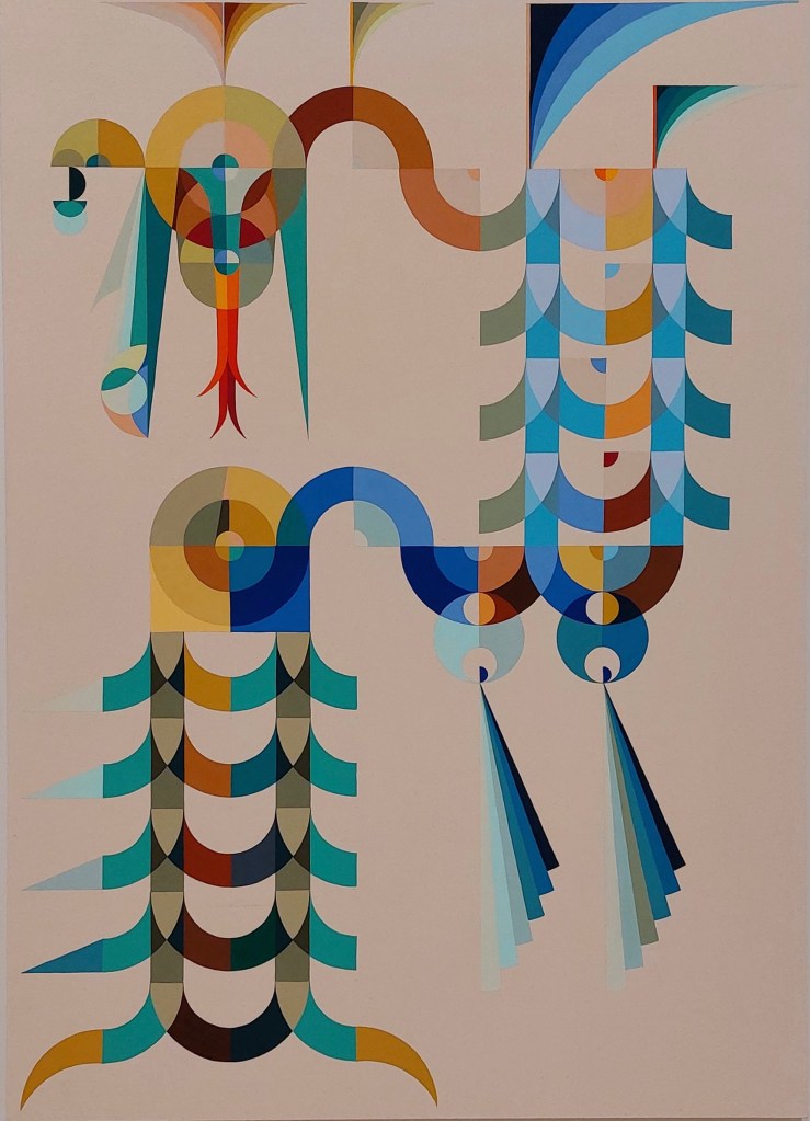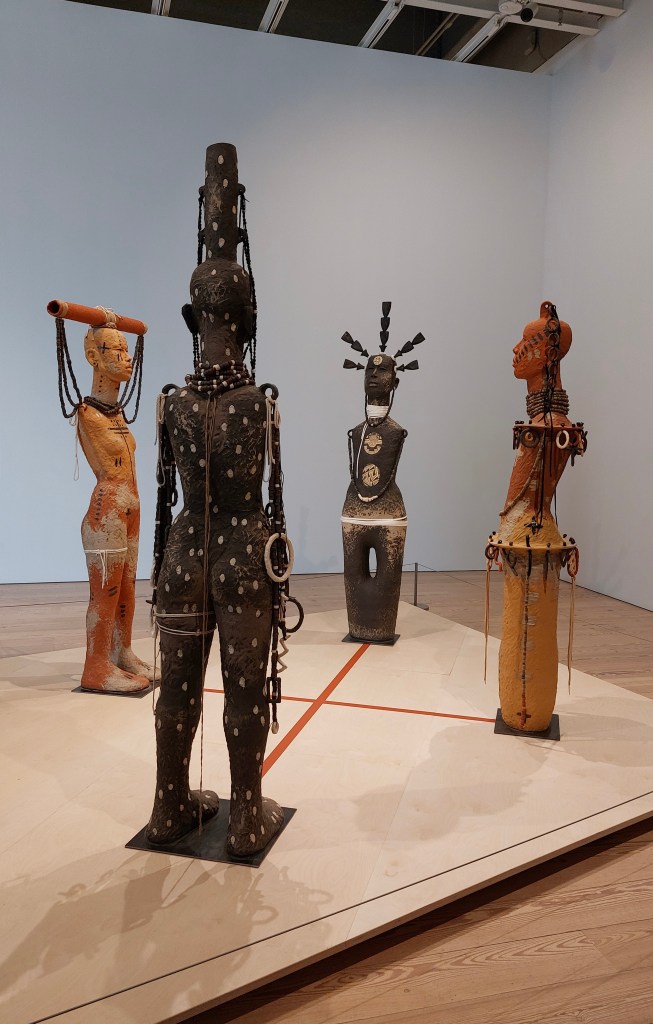 Die ausgestellten Objekte reichen von Malerei über Collagen, Skulpturen aus unterschiedlichen Materialien bis zu Filmen. Natürlich wirkt alles am besten, wenn man es selbst wahrnehmen kann. Aber als Appetithappen kann ich Euch trotzdem eine Sicht auf das das schon gefährlich schiefe Weiße Haus aus Erde (Kiyan Williams, Ruins of the Empire II or The Earth Swallows the Master’s House) geben. Oder die vier Daughters von Rose B. Simpson, die durch ihre Aufstellung eine gemeinsame Kraft entfalten. Oder eines der Bilder von Eamon Ore-Giron aus der Talking Shit Serie, in dem er sich mit alten peruanischen oder mexikanischen Gottheiten und deren sich wandelnder Wahrnehmung auseinandersetzt.