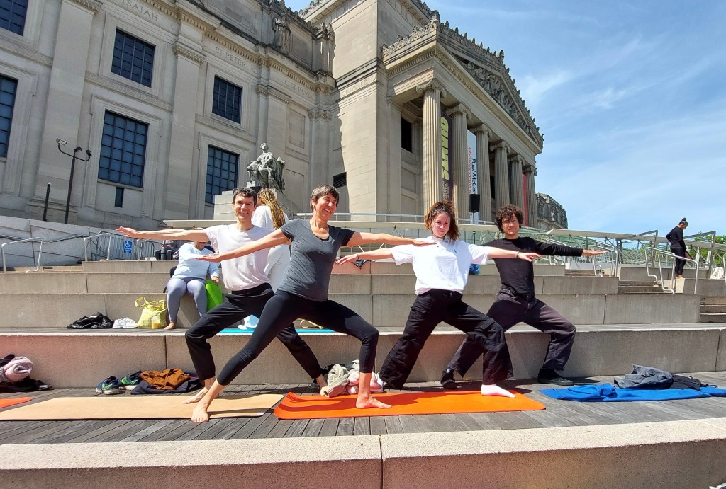 An die Kombination Museum und Tanzparty haben wir uns schon lange gewöhnt, gehört doch z.B. die MoMa-Party inzwischen schon zu unseren allmonatlichen Ritualen. So wurde es jetzt höchste Zeit für ein neues Paket: Yoga und Museum. (Der Ehrlichkeit halber: Irgendein Angebot dieser Art ist mir in Berlin auch schon einmal untergekommen; ausprobiert habe ich es bislang allerdings nicht.) Unser „Hausmuseum“, das Brooklyn Museum bietet im Sommer auf den Stufen vor dem altehrwürdigen Haus an Samstagen einstündige Yoga-Kurse an, den Eintritt ins Museum gibt’s dann gratis hinterher. – Oder: wenn das Wetter zu schlecht für Outdoor-Sport ist, dann hat man zumindest schon einmal eine Eintrittskarte ins Museum erworben.