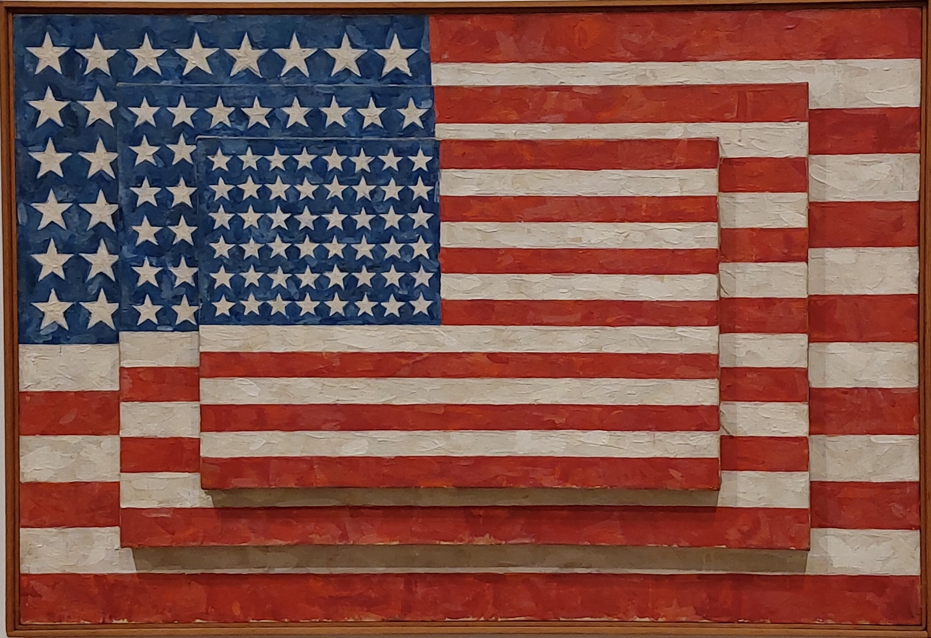 Unter freie Meinungsäußerung oder Kunstfreiheit fallen wohl auch die Flaggen-Bilder von Jasper Johns, die in unter anderem in verschiedenen New Yorker Museen ausgestellt werden. Aus touristischer Perspektive handelt es sich um dankbare Fotomotive. Aus künstlerischer Perspektive sind seine Flaggen-Bilder wie auch die Karten ein Spiel mit Symbolen, ein Hinterfragen wo Flaggen auf der Skala zwischen Gebrauchsgegenstand und Heiligtum stehen, was eigentlich repräsentiert wird. Für mich (besonders als Deutsche, vor-Sommermärchen-Geborene?), mehr als 50 Jahr nach Entstehung der Bilder immer noch offene Fragen.