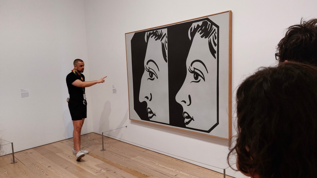 Den regenbogenbunt beleuchteten Hauptsaal des Brooklyn Museums habe ich Euch neulich schon gezeigt; wunderschön gekleidete und herausgeputzte Paare in allen Kombinationen und Hautfarben müsst ihr Euch selber dazu denken. Am vergangenen Second Sunday im Whitney Museum gab es zusätzlich zu Kunstwerken und schönen Menschen auch queeres Programm. Das übliche Mitmachaktivität für Museumsbesucher:innen bestand dieses Mal darin, dass man auf irisierendem Papier eine Botschaft des Empowerment gestalten sollte – passend zu der Statue einer Aktivistin, die auf einer der Terassen ausgestellt war. Außerdem gab es Kurzführungen unter dem Titel „Queering the Collection“, bei denen ein wortgewandter Museumsmitarbeiter die Werke von mehr oder weniger offen schwulen Künstlern einordnete, darunter auch die „Drei Flaggen“ von Jasper Johns und „Before and After“ von Andy Warhol.