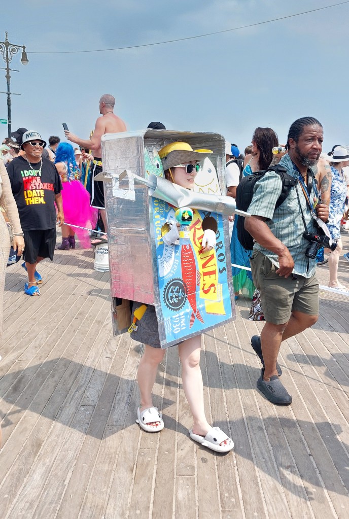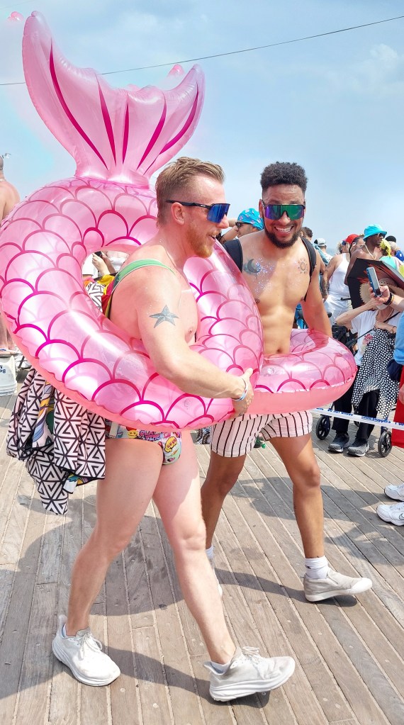 Typisch amerikanisch oder typisch New York ist abgesehen vom großen Jubel und begeistert mitgehendem Publikum – häufig genauso schön verkleidet wir die aktiv Teilnehmenden -, dass das ganze Ereignis sehr unaufgeregt inklusiv ist: Meerjungfrauen sind alt und jung, dick und dünn, männlich, weiblich oder sonst etwas, sie können laufen oder eben nicht (mehr). Hauptsache, die Verkleidung stimmt. Und in dieser Hinsicht kann man noch Einiges für die nächste Sommer-Motto-Party mitnehmen. Hüte mit komplizierten Dreimastern, Röcke mit Tentakeln, Dreizacke und Netze, Fischschwänze, laufende Sardinenbüchsen, zu Quallen umgestaltete Regenschirme … Die politisch engagierteren haben sich ihre Kostüme aus Plastikabfall gebastelt und weisen auf die Vermüllung der Meere hin. LGBTQ+Botschaften gibt es natürlich auch.