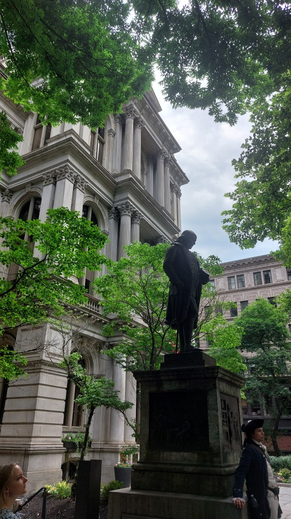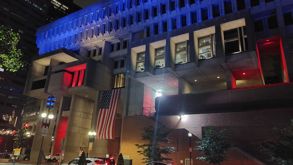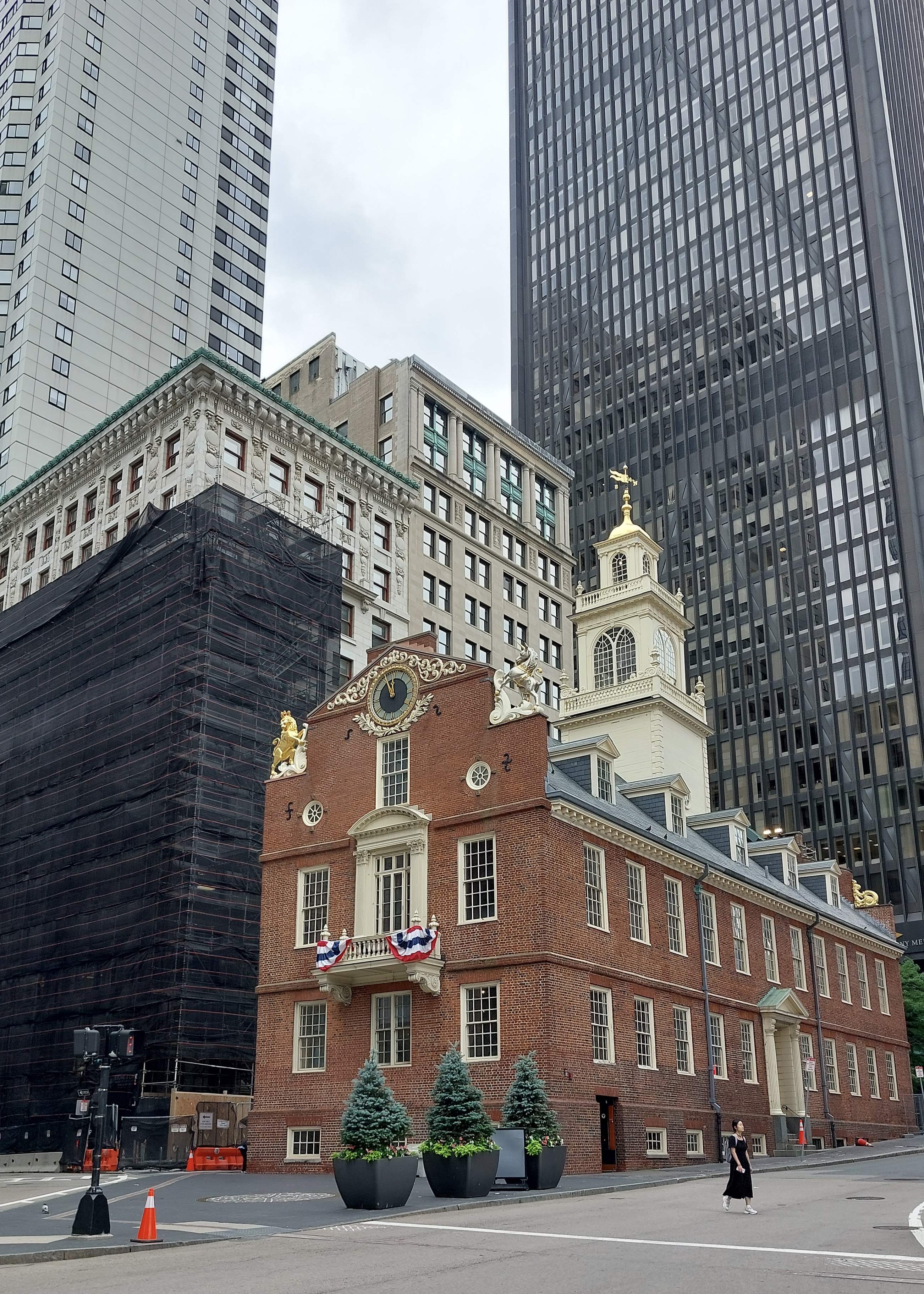 Doch Boston ist vielfältig. Es gibt natürlich Einiges zur Geschichte der USA zu entdecken und anzusehen, wobei wir uns angesichts der Temperaturen, Menschenmengen und Preise da dieses Mal zurückgehalten haben. Das alte Rathaus haben wir aber (von außen) gesehen und im Kontrast dazu das neue, brutalistische Gebäude, das am langen Wochenende vom 4. Juli noch in Nationalfarben angestrahlt war.