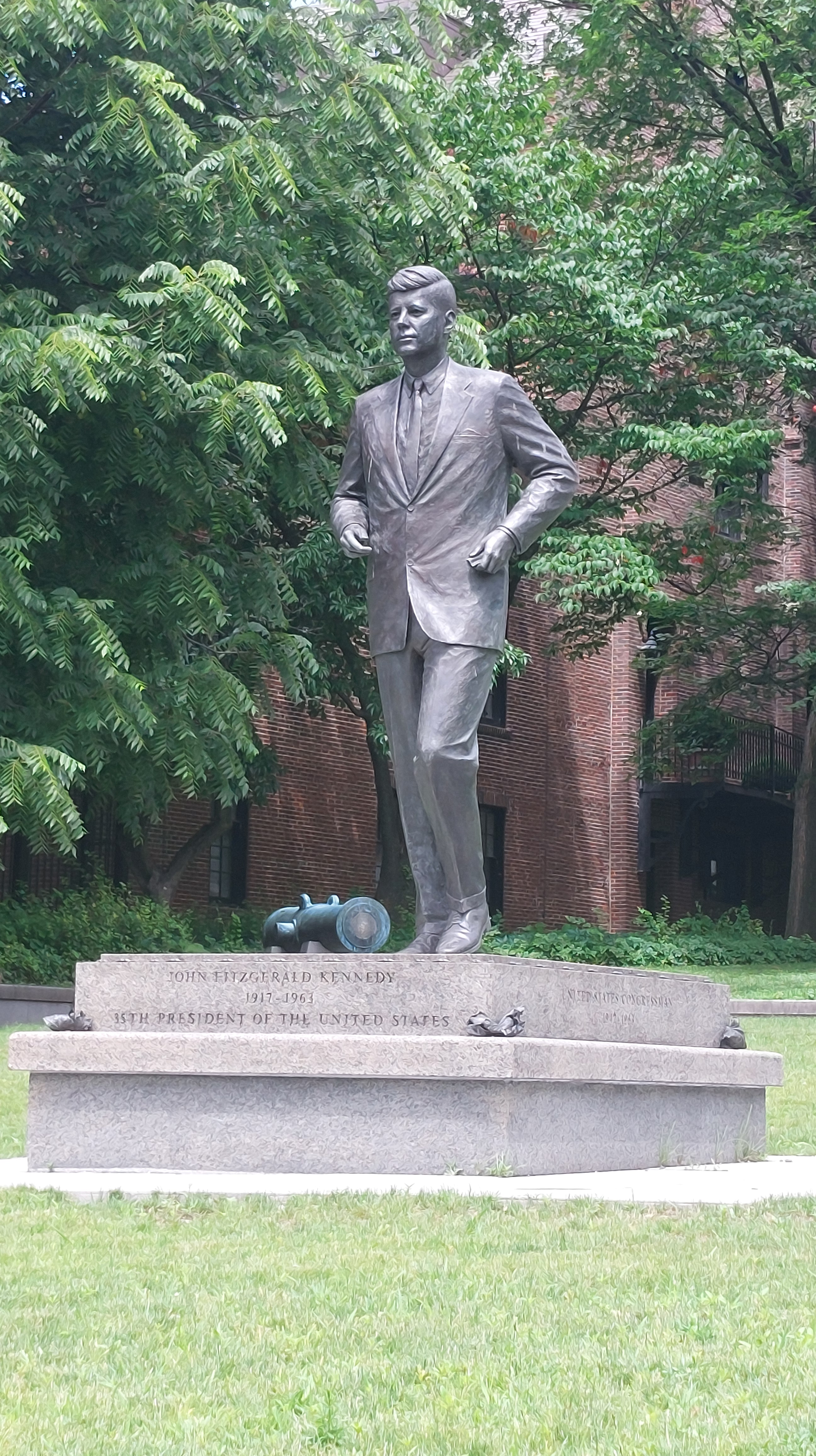 Nicht fehlen darf natürlich auch ein Hinweis auf einen der illustren Söhne der Stadt, John F. Kennedy, der in typisch amerikanischer Präsidenten-Pose dynamisch vorwärts schreitend im Garten des State House steht.