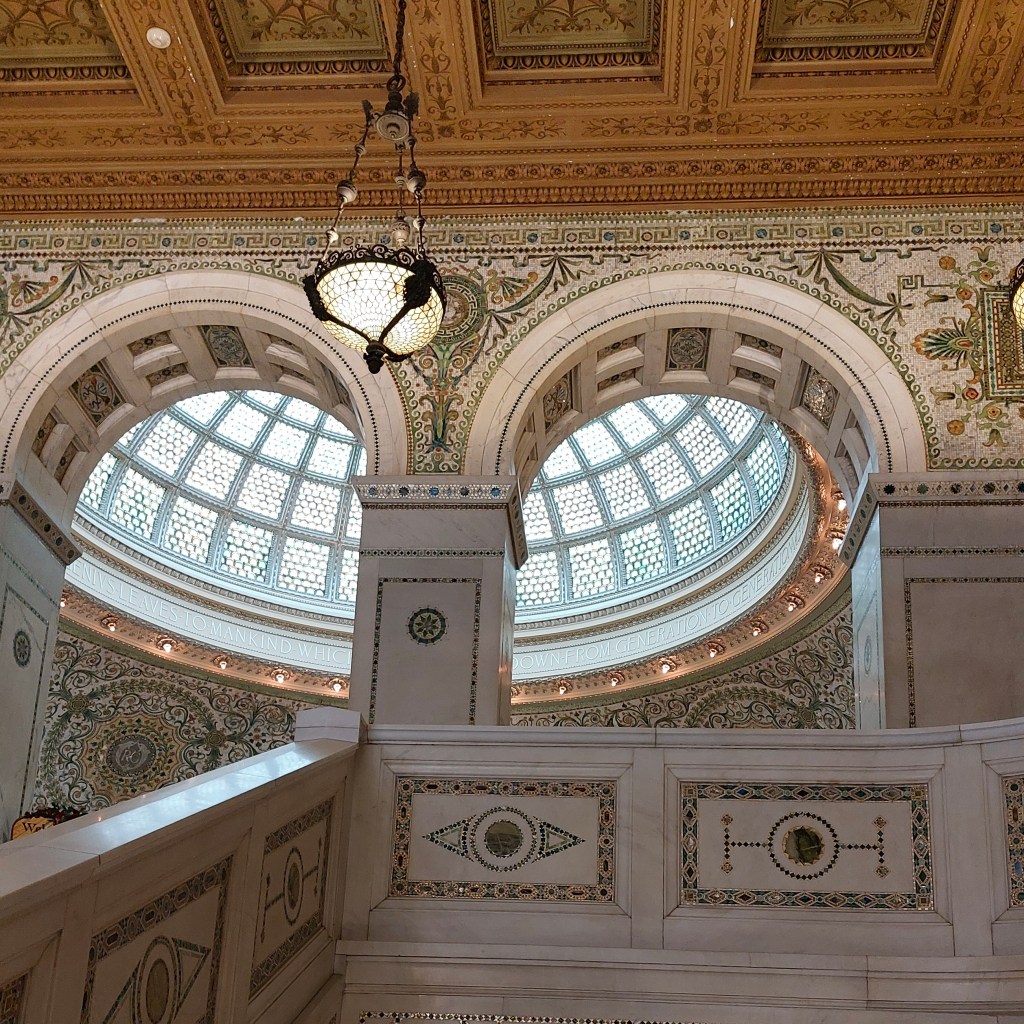 Ganz offiziell und ohne Eintrittspreis sind wir dagegen in das Chicago Cultural Center hineingegangen. Das auch außen prächtige Bauwerk aus 1897, das allerdings im Vergleich zu seinen Nachbarn „flach“ ist, ist auch innen reich dekoriert mit Mosaiken und einer riesigen Kuppel aus Tiffany-Glas. Hier finden nicht nur offizielle Empfänge der Stadt Chicago und private Feiern, sondern auch kostenlose Kulturveranstaltungen statt. Solange die öffentlichen Mittel dafür nicht gekürzt werden.
