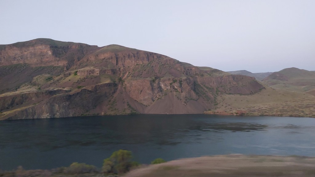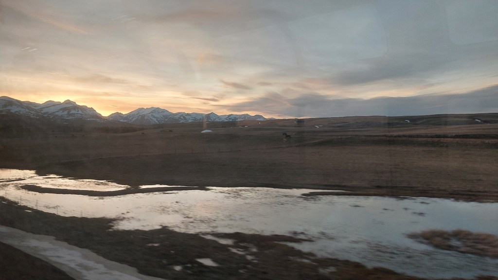 Mein innerer Monolog an diesem Teil der Bahnreise kreiste um „ach, Europa!“, „so lerne ich mal etwas über die Größe der USA“, „nie mehr wieder diese Strecke“ – und zum Glück hatte ich auch noch etwas gedruckten Lesestoff dabei. Doch am Abend tauchten dann am Horizont weiß bedeckte Berge auf, denen wir immer näher kamen. Die ersten Schneefelder haben wir immerhin noch bei Tageslicht erreicht, danach wurde es immer kurviger und leider auch so dunkel, dass wir möglicherweise den schönsten Abschnitt der Strecke verpasst haben.